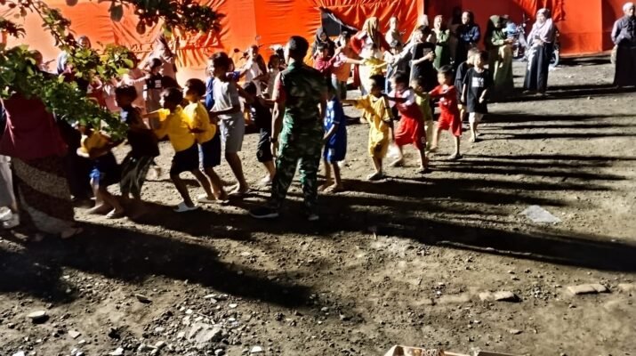 Lumajang — Upaya pemulihan kondisi psikologis anak-anak pengungsi akibat erupsi Gunung Semeru terus dilakukan oleh berbagai pihak. Pada Senin malam (1/12/2025), Babinsa Oro-oro Ombo Koramil 0821-14/Pronojiwo, Serda Yayat Sugiyat bersama para relawan menggelar kegiatan permainan bersama anak-anak di lokasi pengungsian yang berada di SMPN 02 Pronojiwo.