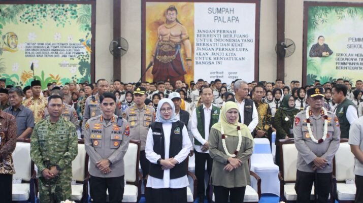 BANYUWANGI — Komandan Kodim 0825 Banyuwangi, Letkol Arm Tryadi Indrawijaya, mengawal langsung kunjungan kerja Khofifah Indar Parawansa dalam rangka peresmian sarana dan prasarana SMA 2 Taruna Bhayangkara Jawa Timur serta revitalisasi dan rehabilitasi SMA, SMK, dan SLB negeri maupun swasta se-Kabupaten Banyuwangi dan Situbondo, Sabtu (28/1/2026). Kegiatan yang berlangsung pukul 13.45–15.30 WIB di Jalan Pandan, Desa Kembiritan, Kecamatan Genteng itu diikuti sekitar 250 undangan dan menjadi simbol komitmen Pemerintah Provinsi Jawa Timur dalam pemerataan akses pendidikan berkualitas.
