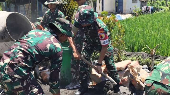 Tampak jelas Letkol Czi Bayu Nugroho tak segan turun langsung, memasukkan pasir di mesin molen/alat penyampur adonanan cor dan memastikan setiap jengkal saluran air terbangun sesuai standar. Keringat yang menetes dari Dansatgas menjadi simbol kemanunggalan TNI dengan rakyat, sebuah wujud nyata kepedulian terhadap infrastruktur dasar desa.