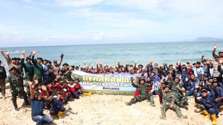Semangat gotong royong menyelimuti pesisir Pantai Pancur saat jajaran Kodim 0825/Banyuwangi bersama warga dan instansi terkait bahu-membahu dalam Gerakan ASRI (Aman, Sehat, Resik, dan