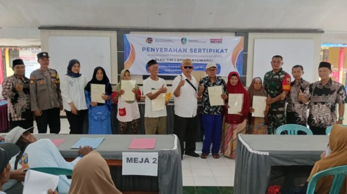Banyuwangi – Ribuan warga tampak sumringah saat menerima sertifikat tanah mereka melalui program Pendaftaran Tanah Sistematis Lengkap (PTSL) yang digelar di Balai Desa Sumberkencono,
