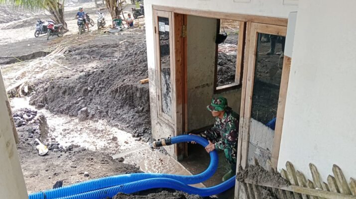 Pembersihan dilakukan di beberapa rumah yang terdampak paling parah, di mana material lahar dingin berupa lumpur pekat masuk hingga ke dalam ruangan dan merusak perabotan warga. Dengan menggunakan selang bertekanan, Serda Samsul bersama warga menggelontor lantai, dinding, dan halaman rumah agar kembali layak ditempati.